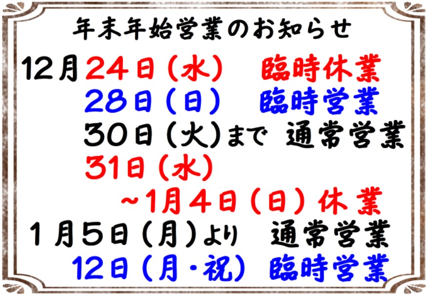- 営業状況により閉店時間を早める場合もございます。 ご了承願います。